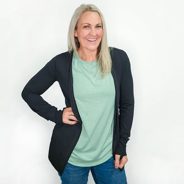 Light and breezy, this open cardigan is designed to be the go-to layer you’ll reach for again and again. With a longer length for extra coverage and tailored cuffs for a refined touch, it drapes beautifully over any outfit. Thumbholes give it that comfortable, relaxed feel while keeping your sleeves in place. Free of buttons and pockets for a clean, modern look, this cardigan is made for easy styling—perfect with jeans, dresses, or leggings. Slip it on, and feel effortlessly put together!