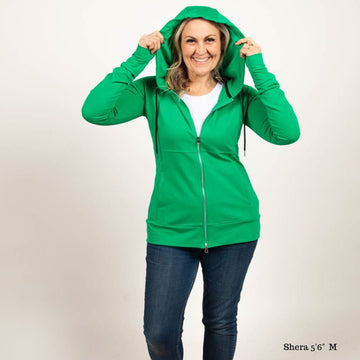 Meet your new favorite hoodie—a striking Kelly Green zip-up that’s as stylish as it is comfortable. Designed with our signature hourglass patterning, this hoodie gives you a flattering fit that’s never boxy. Plus, with thoughtful details like deep pockets inside and out, an oversized hood, and a two-way zipper, it’s made to move with you! Whether you’re out running errands or lounging in style, this versatile zip-up is your new go-to for effortless fashion and function!