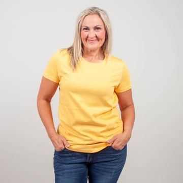 Oh girl, this Sunset Yellow cotton stretch tee in a rich, goldenrod hue that brings warmth to any outfit. This isn’t your average yellow—it’s a subtle sunset shade with a hint of earthiness for that effortlessly elevated vibe.